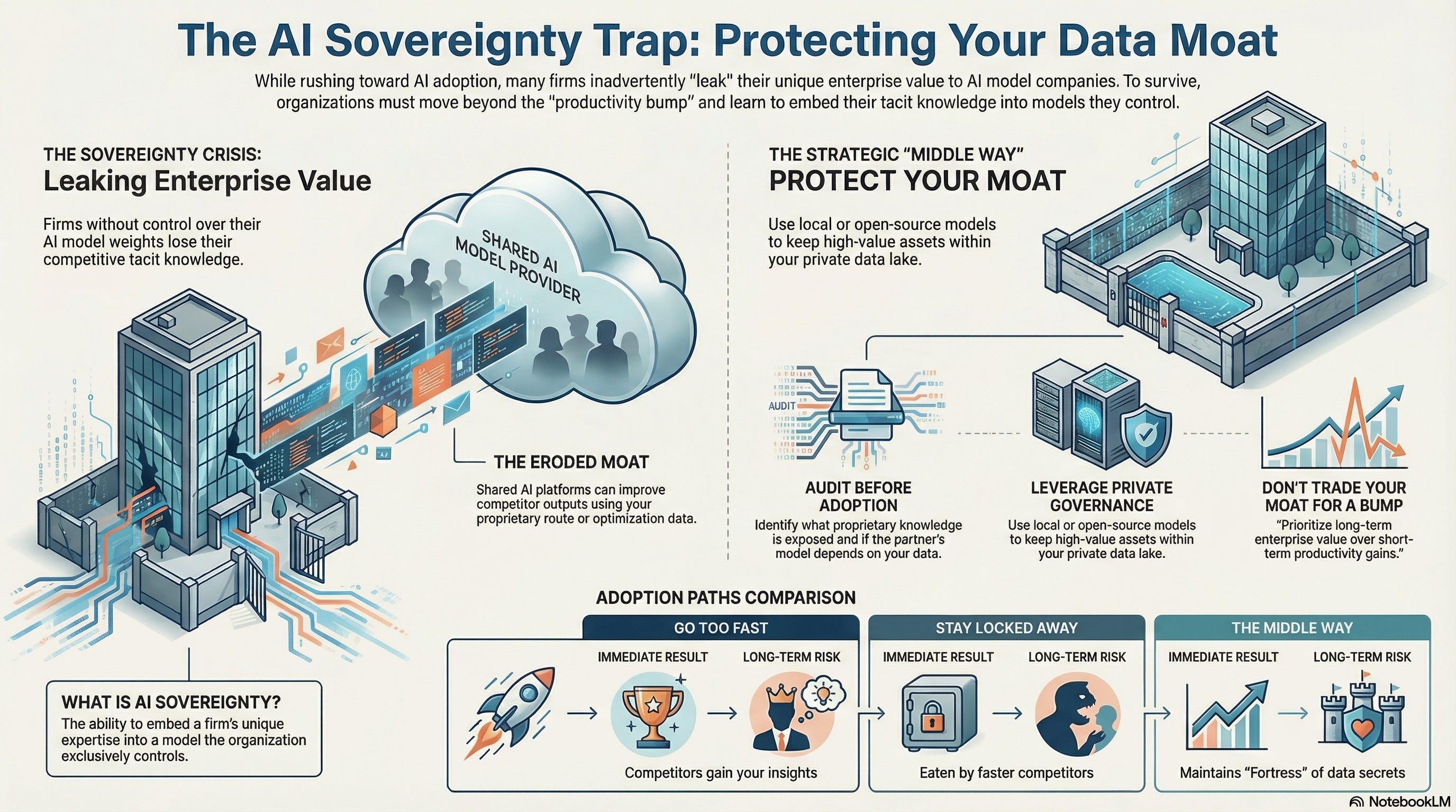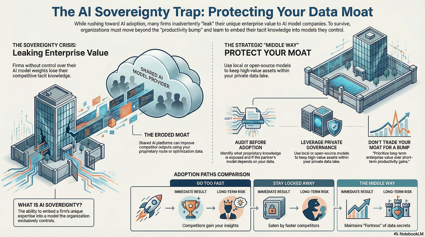 Imagine a logistics company feeding years of route-optimization data into an AI model they don’t own. In 18 months, that intelligence will improve outputs for every competitor on the same platform.
